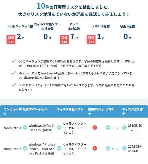 PC毎のOSバージョン、ウィルス対策ソフトの有無、メモリの容量、ディスクの空き容量などをレポートします。
