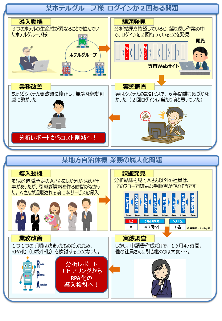 パソコンログを収集し、繰返しパターン毎の作業時間、ファイル毎の作業時間、Webサイト毎の閲覧時間を見える化します。