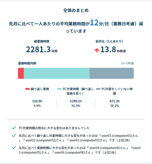 パソコンログを収集し、当月の働き方の全体像や月毎の変化、社員別の業務時間実績をレポートします。