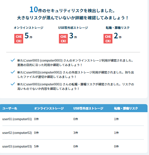 USBメモリによるファイル持ち出し、オンラインストレージへのアクセス等のセキュリティリスクを見える化します。